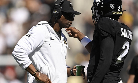 BOULDER, COLORADO – AUGUST 9: Head Coach Deion Sanders talks with his son Colorado Buffaloes quarterback Shedeur Sanders (2) during the first half at Folsom Field on September 9, 2023 in Boulder, Colorado. Head Coach Deion Sanders led the Colorado Buffaloes in a matchup against their long-time rivals, the Nebraska Cornhuskers, during Coach Prime’s highly anticipated home debut. (Photo by RJ Sangosti/MediaNews Group/The Denver Post via Getty Images)