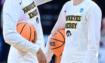 IOWA CITY, IA – MARCH 25: Iowa forward JadaGyamfi (23) greets Iowa guard Caitlin Clark (22) before the West Virginia Mountaineers game versus the Iowa Hawkeyes in the second round of the NCAA Division I Women’s Championship on March 25, 2024, at Carver-Hawkeye Arena in Iowa City, IA. (Photo by Keith Gillett/Icon Sportswire via Getty Images)