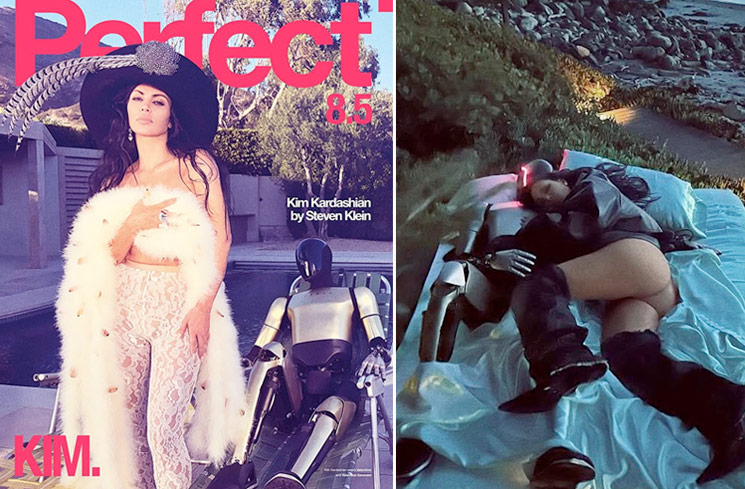 Kim Kardashian graces the cover of Perfect magazine with her Tesla robot named Optimus. The cover was shot by Steven Klein.