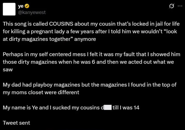 “This song is called COUSINS,” Kanye wrote on X (Twitter). He said the song is “about my cousin that’s locked in jail for life for killing a pregnant lady a few years after I told him we wouldn’t ‘look at dirty magazines together’ anymore.”