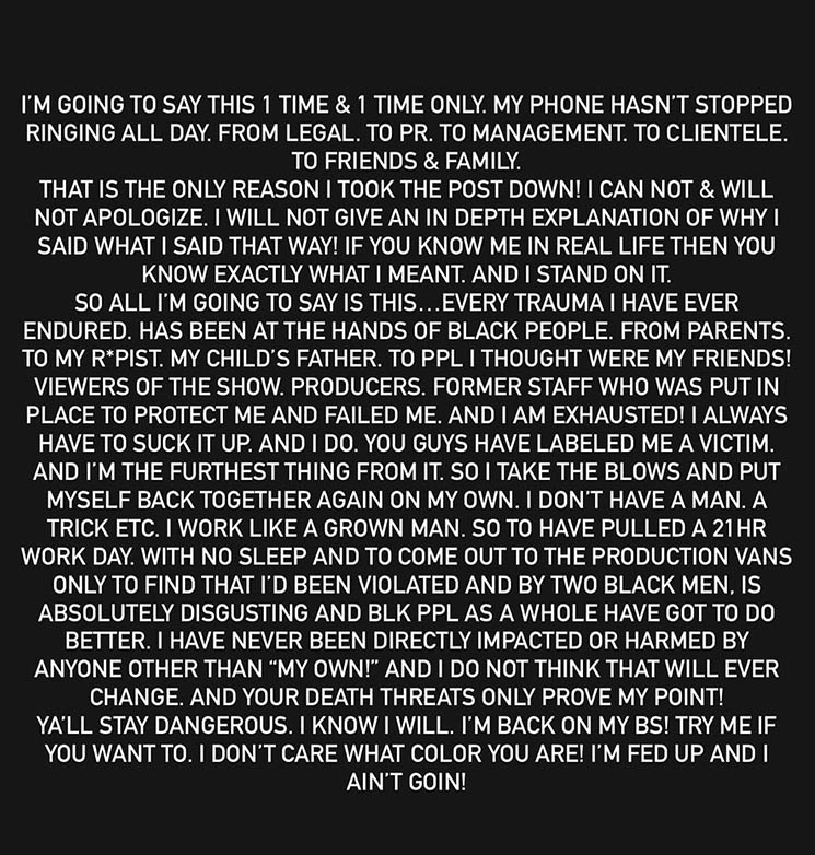 She wrote in another post: “Shout out to the dummies that broke into my truck with all of my production equipment, my talent wardrobe, and props in it! I watched the surveillance footage with LAPD. And I had the cars dusted for fingerprints! Don’t ever ask me why I don’t like blk ppl! This is why! Just dumb. Dusty. Ditsy. Deaf. Broke. And lazy for no reason! I work too hard. And it wasn’t enough for you to just rob me. You had to trash the trucks, leave the doors open so the lights were on, and the car batteries died. On top of that… you stole my seeing glasses. Complete wastes of life! And let’s let Circa know they need cameras on floors 3-5! Protect your public patrons [sic].”