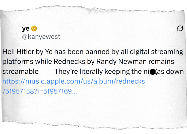 Kanye West’s new song “Heil Hitler” has been banned on all digital streaming platforms. Kanye took to X to complain that his new song is “banned by all digital streaming platforms while Rednecks by Randy Newman remains streamable.”