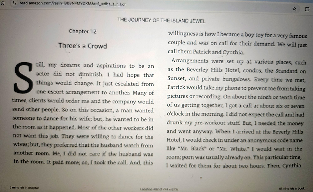 “Edmond’s book, “The Journey of the Island Jewel” – self-published in March 2020, was co-written with someone else. I read it a few years ago but didn’t read all of it. Last night I looked at the table of conatents and knew that Chapter 12, “Threes a Crowd”, references Puffy as “Patrick” and “Cynthia” as Cassie. The screenshot is of an encounter Edmond had with Puffy and Cassie.”
