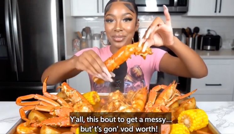 The mukbang trend began in South Korea and involves eating large trays of seafood, corn on the cob, potatoes, and vegetables.