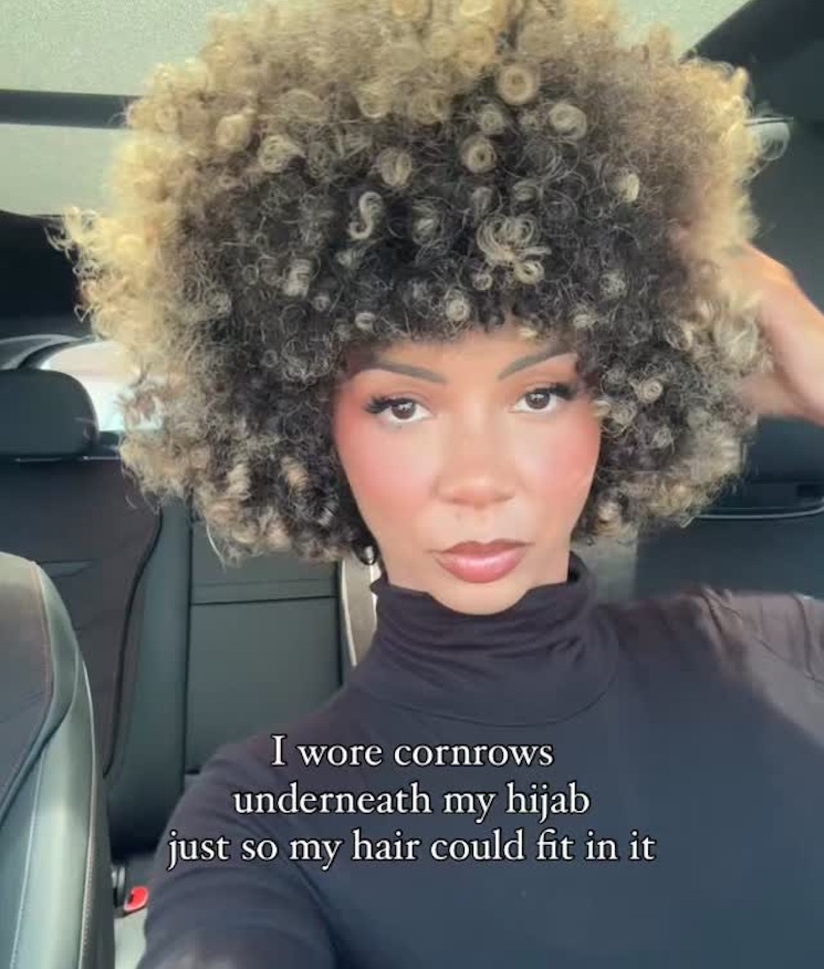 She wrote on the video intro: “I wore cornrows underneath my hijab just so my hair could fit in it.”