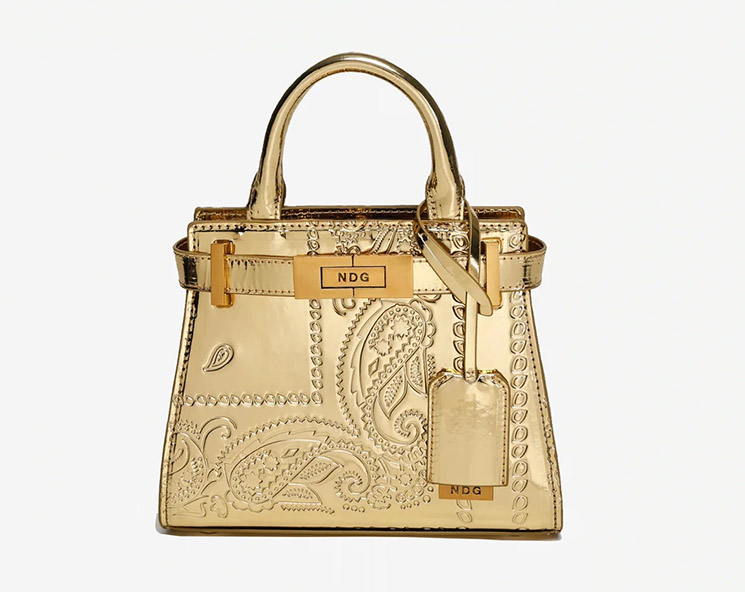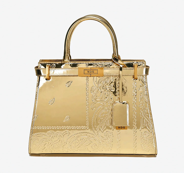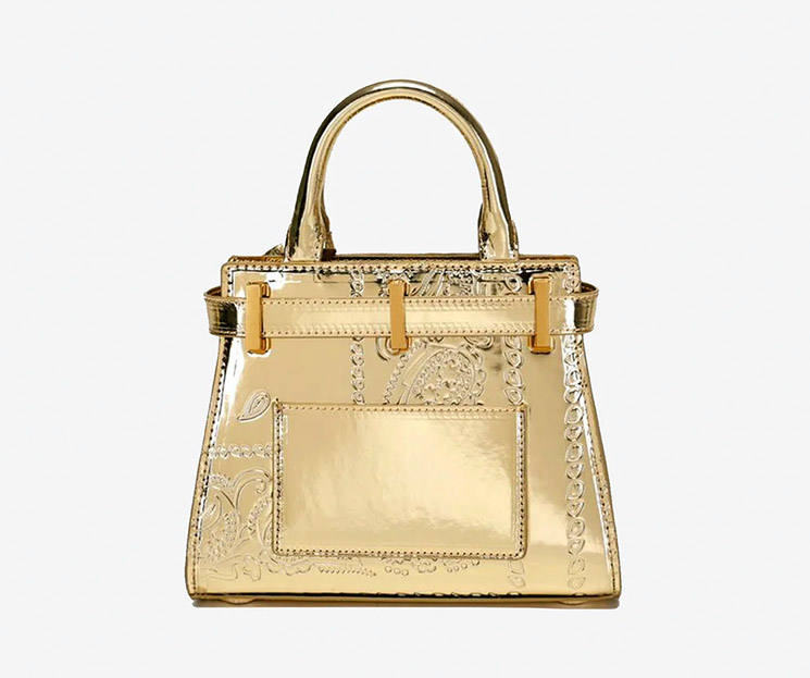 According to the website, the Jeanne 200MM Gold Paisley handbag is constructed with high-quality Gold vegan leather. It is finished with iconic engraved paisley, gold-tone signature hardware, and plain leather accents and sized to hold all smartphones.