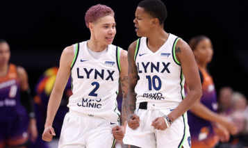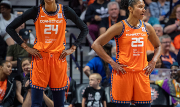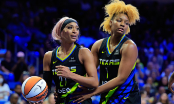 ARLINGTON, TX – MAY 31: Dallas Wings guard DiJonai Carrington (21) gets held by Dallas Wings forward NaLyssa Smith (1) after a play during the game against the Chicago Sky on May 31, 2025, at the College Park Center in Arlington, TX. (Photo by Adam Davis/Icon Sportswire via Getty Images)