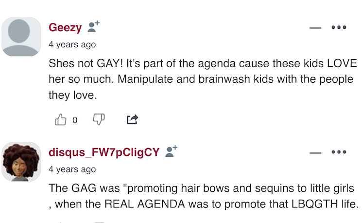 Reader Geezy wrote in the comments: “Shes not GAY! It’s part of the agenda cause these kids LOVE her so much. Manipulate and brainwash kids with the people they love.”