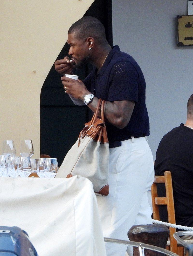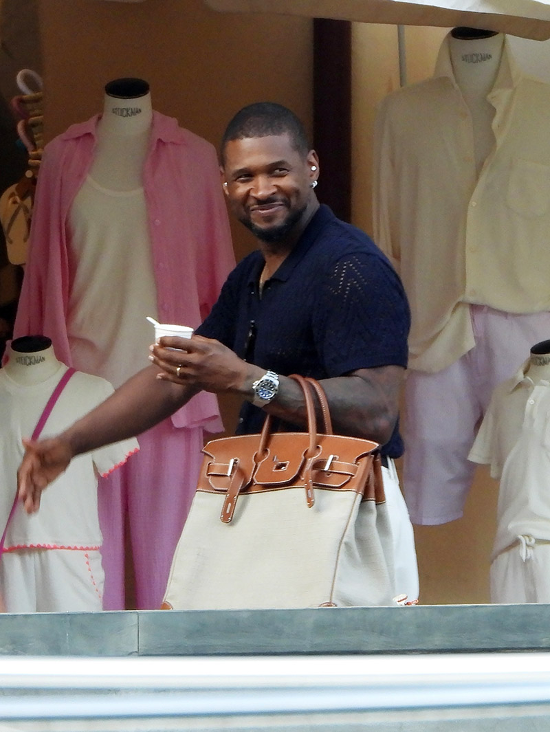 R&B crooner Usher was seen vacationing with his wife Jennifer Goicoechea in the coastal town of Portofino, Italy on Tuesday. Usher, 46, rocked a blue short sleeve shirt with white slacks and black deck sneakers. He accessorized with a vintage 1959 Hermès canvas tote bag.