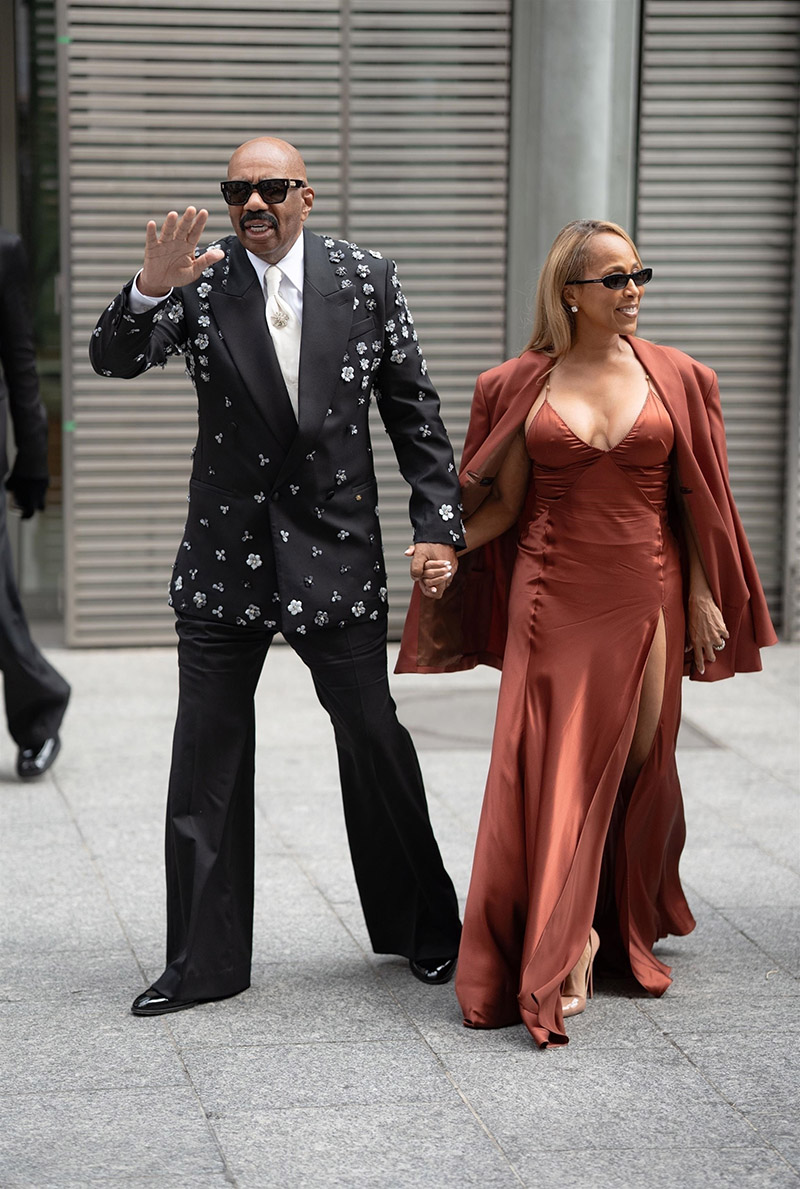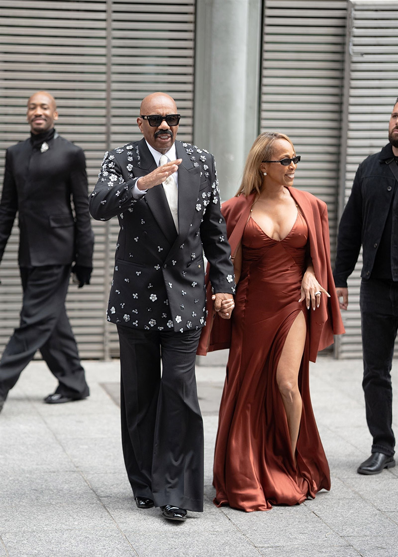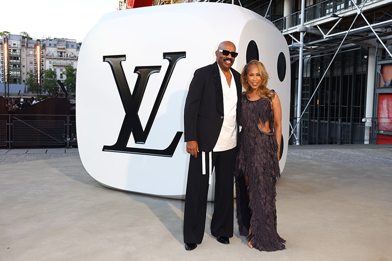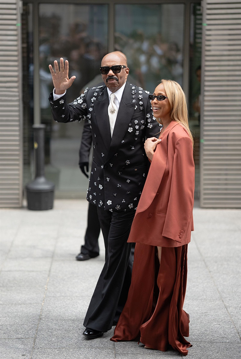 Steve Harvey and his wife Marjorie Harvey attended the Amiri Menswear 2026 Spring/Summer Runway show in Paris on Thursday, June 26. Marjorie wore a silk dress with thigh high split and matching jacket. While Steve donned a black tuxedo jacket.