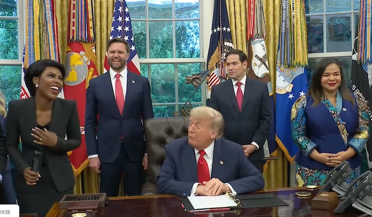 President Donald Trump paused his press conference in the Oval Office to compliment Angolan reporter Hariana Veras.