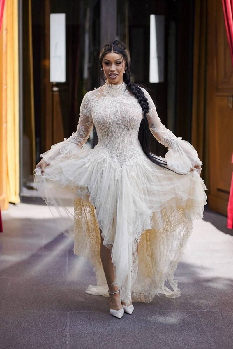 Cardi B turned heads at the Balenciaga Haute Couture Fall/Winter 2025/2026 show in Paris, France on Tuesday, July 8. She wore a black long sleeve lace frock, black tights and pointy toe black pumps all by Belanciaga.