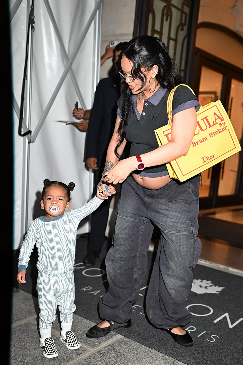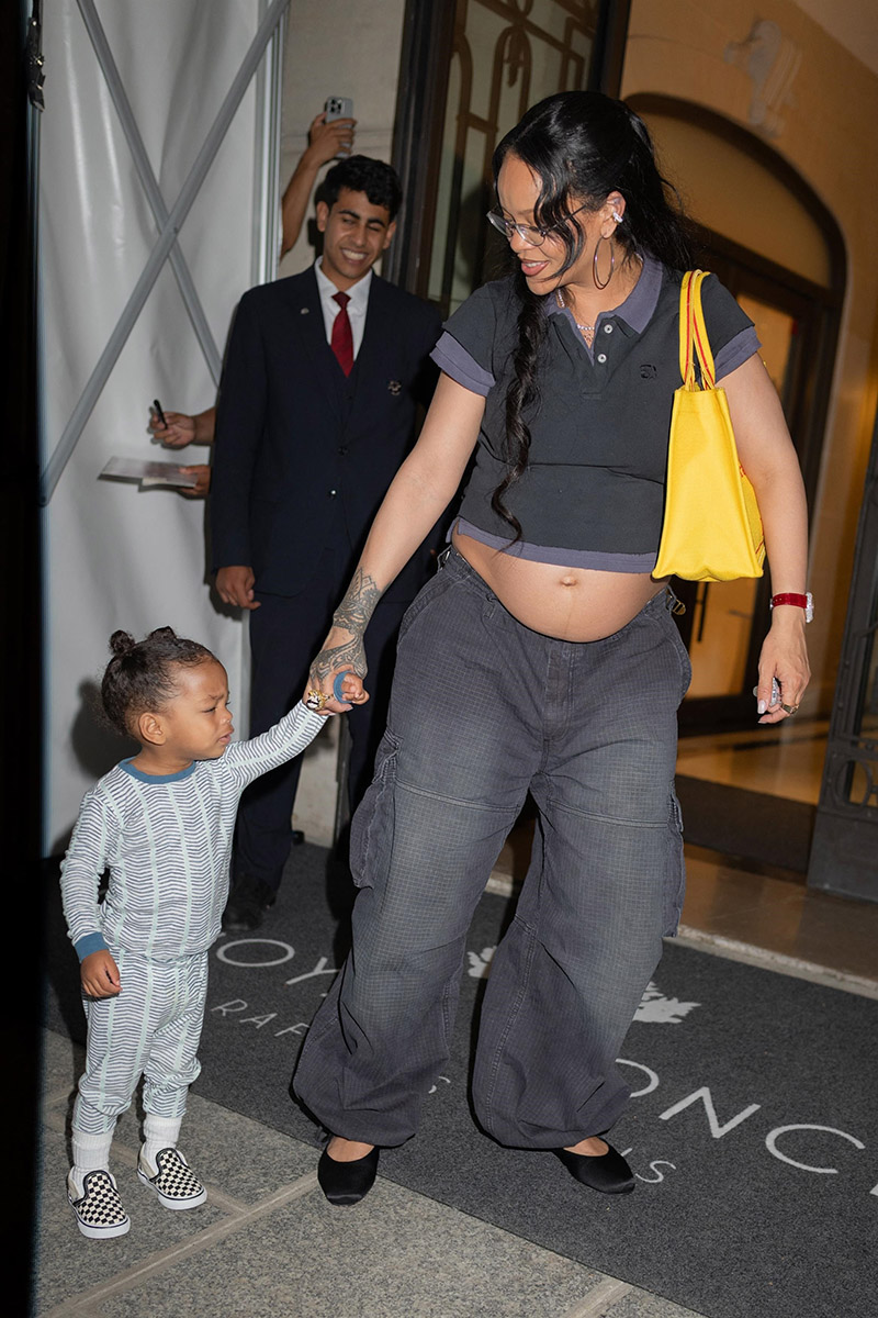 Rihanna attended the Dior Spring 2026 Men’s Fashion show with son Riot Rose in Paris. The 37-year-old mom-of-3 wore a shrunken layered polo shirt by Alexander Wang that revealed her baby bump. She also rocked grey cargo pants and black ballet flats.