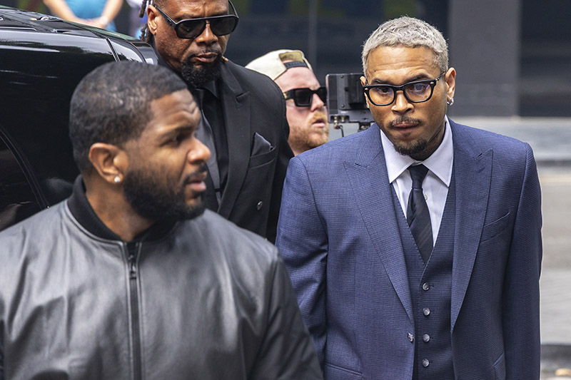 Brown, 36, was accompanied to court by his manager, Anthony Wilson, left, also known as singer Monica’s boyfriend.