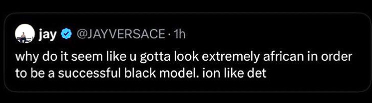 He wrote: “Why do it seem like you gotta look extremely african in order to be a successful black model. ion like det [sic].”
