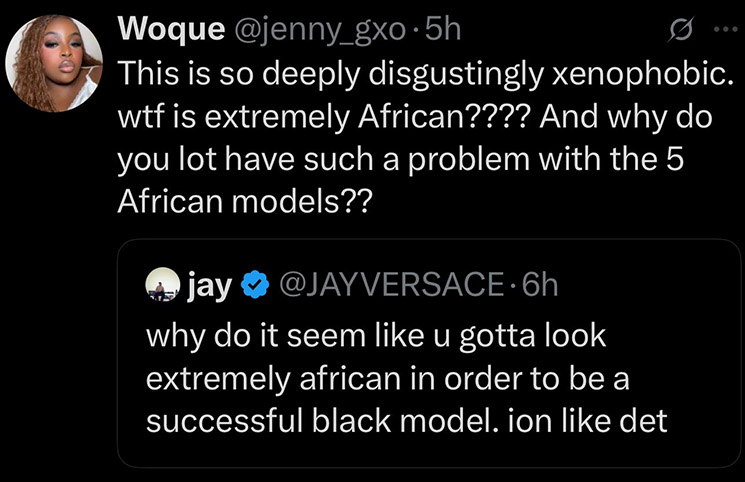 One upset X user wrote: “That Jay Versace tweet is very tired and disgusting. Last year African models looked ‘Eurocentric’ and now you people are saying they look ‘extremely African’. So which one is it? Bunch of weirdos. Africa is a huge continent with people that have diverse phenotypes and features.”