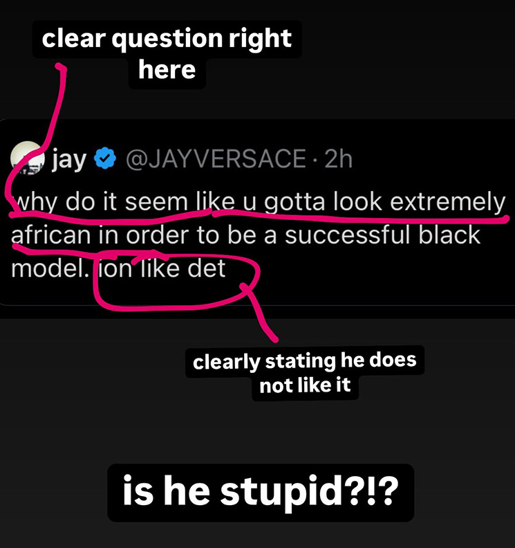 Jay’s question was critical of the modeling industry overlooking Black models, but his post was misinterpreted as being critical of African facial features in general.