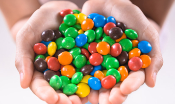 Young woman holding colorful chocolate drops over gray background. Close-up. Photo by GeorgeRudy/iStock / Getty Images Plus