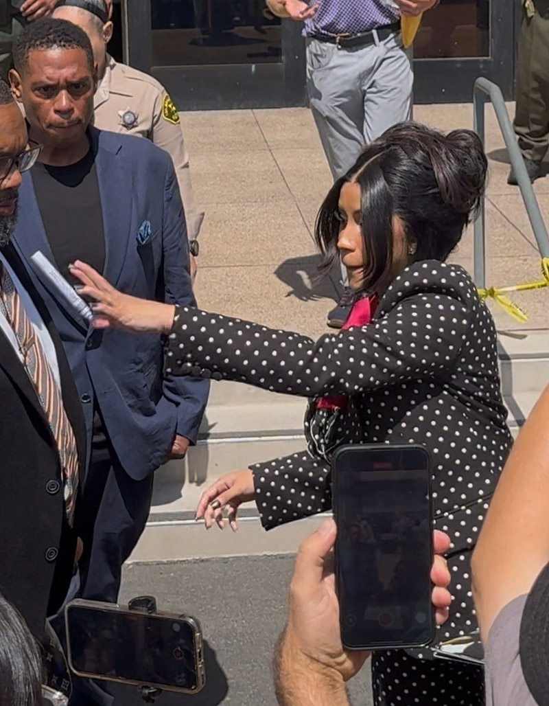 Cardi B looked noticeably pregnant as she arrived at the courthouse. She wore a polka dot pantsuit with a matching blouse.