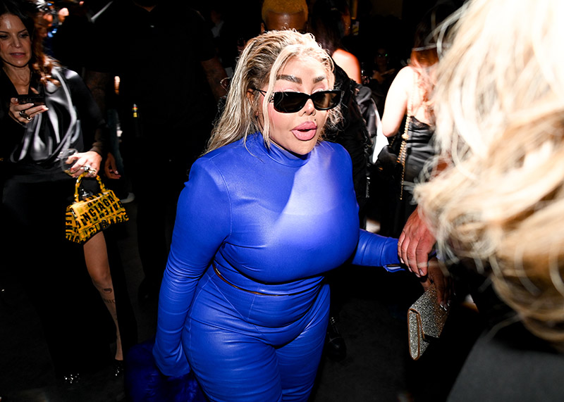 Lil Kim wore a blue leather bodysuit from LaQuan’s Spring/Summer 2026 collection. She dragged her blue fur coat along the floor as she was led through the crowd by a bodyguard.