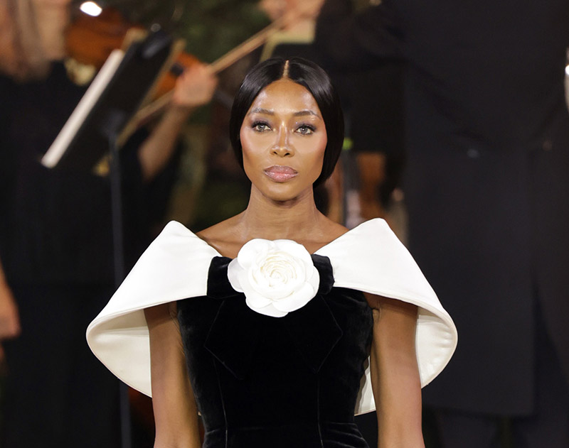 Naomi wore a black velvet pencil gown with a sculpted white cape collar and a single white flower on her chest. Her hair was pulled back in a waist length ponytail.