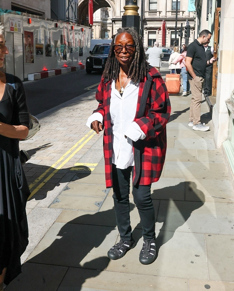 Whoopi was spotted leaving Fortnum & Mason department store in London on Friday. She looked thin and frail and her clothes were hanging off of her.