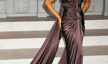 Kerry looked glamorous in a brown, satin strapless off-the-shoulder, floor length gown with a long train by Oscar de la Renta.