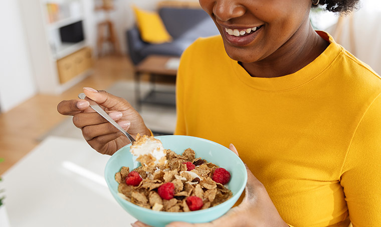 Stock photo: Happy black woman eating breakfast cereal with raspberries and yogurt at home. Photo by Xavier Lorenzo / Moment / Getty Images