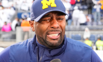 UNIVERSITY PARK, PA – NOVEMBER 11: Michigan Wolverines Offensive Coordinator Sherrone Moore shows emotion after getting the victory as acting head coach during the postgame interview after the College Football game between the Michigan Wolverines and the Penn State Nittany Lions on November 11, 2023, at Beaver Stadium in University Park, PA. (Photo by Gregory Fisher/Icon Sportswire via Getty Images)