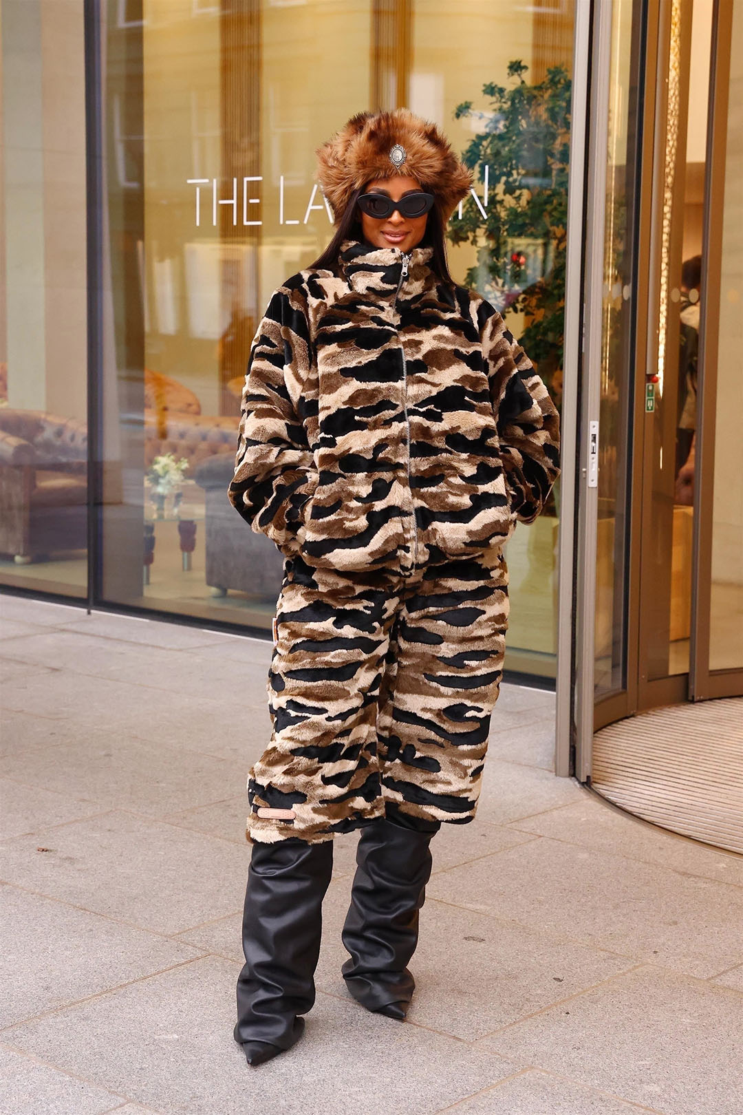 Ciara dressed warmly in a fur jacket and knee length shorts. She accessorized with a fur hat and black boots by Alexandre Vauthier.