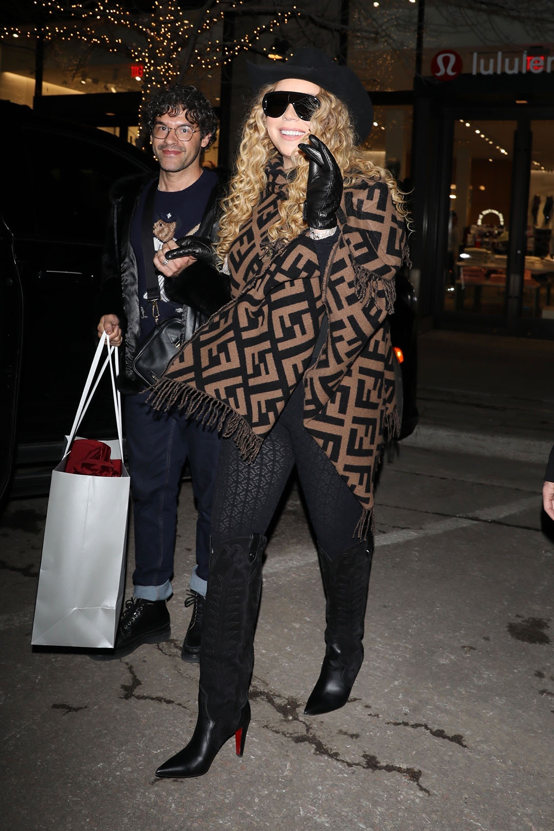 Earlier in the day, the mom-of-2 stepped out wearing the same black leggings for another shopping spree at the Valentino store in Aspen. She completed her lewk with a white fur coat.