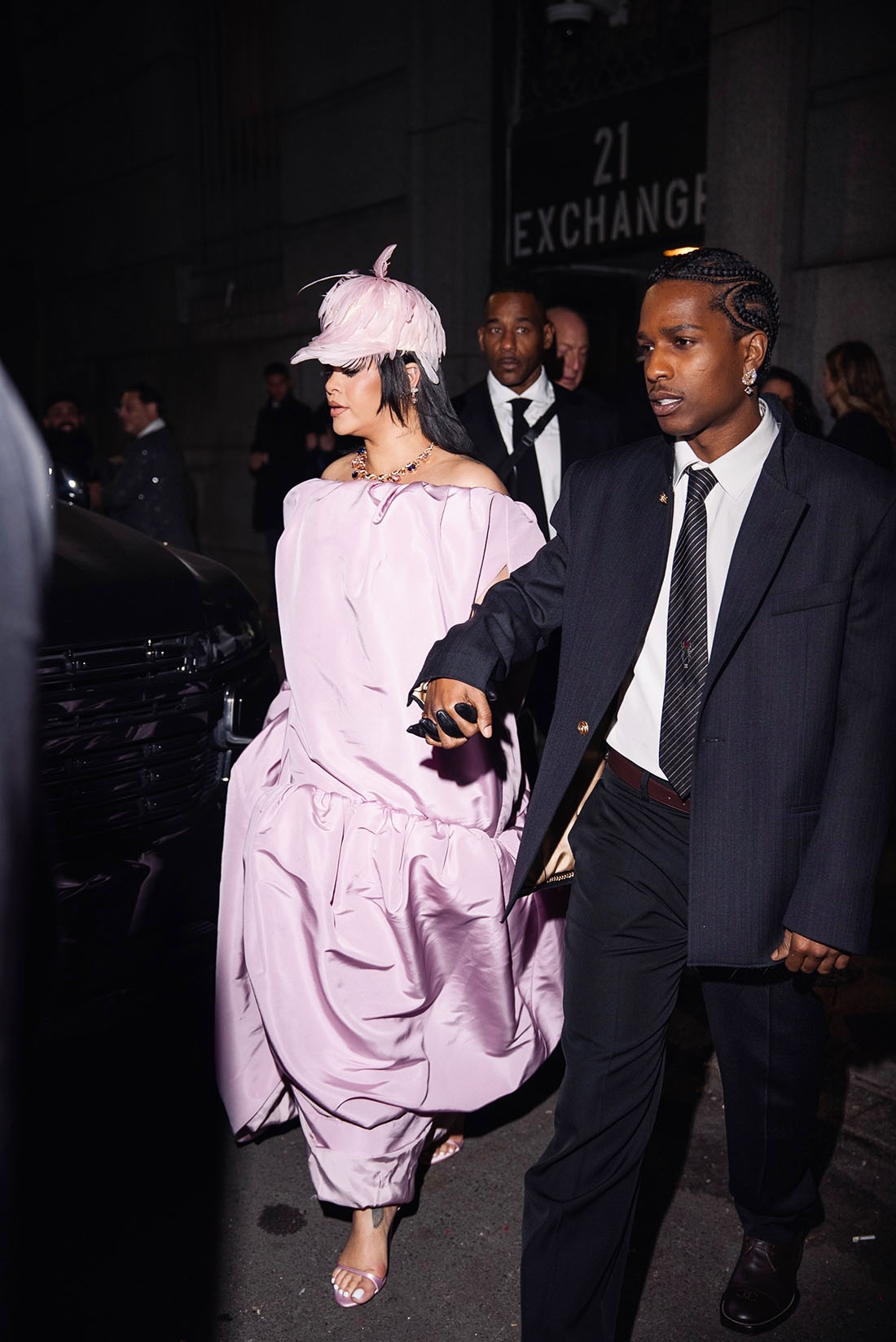RiRi wore an oversized, pink formless dress with a long train and a pink feathered riding hat from Balenciaga’s Spring 2026 collection. The pop singer is still struggling to snap back after recently giving birth to her first daughter.