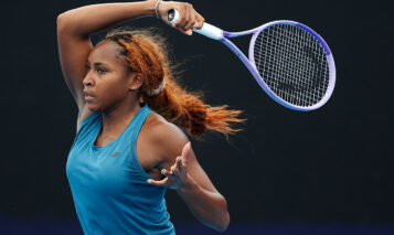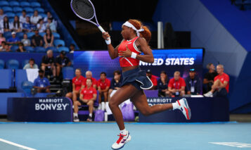 PERTH, AUSTRALIA – JANUARY 07: Coco Gauff of Team USA plays a forehand in the mixed doubles Quarter Finals match against Maria Sakkari and Stefanos Tsitsipas of Team Greece during Day 6 of the United Cup at RAC Arena on January 07, 2026 in Perth, Australia. (Photo by Paul Kane/Getty Images)