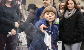 BOISE, ID – MARCH 06: A child tosses a surgical mask into a fire during a mask burning event at the Idaho Statehouse on March 6, 2021 in Boise, Idaho. Citizens and politicians, including Lieutenant Governor Janice McGeachin, gathered in at least 20 cities across the state to protest COVID-19 restrictions. (Photo by Nathan Howard/Getty Images)