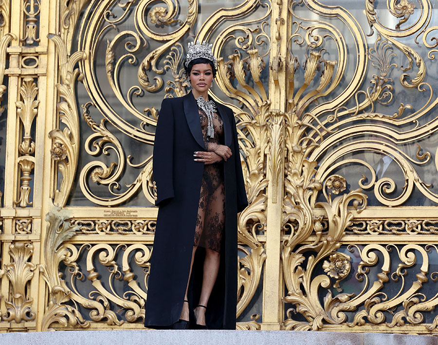 Teyana Taylor wore a crown, a black wool coat, and a sheer bodysuit as she was crowned the Belle of Paris Fashion Week in Paris, France.