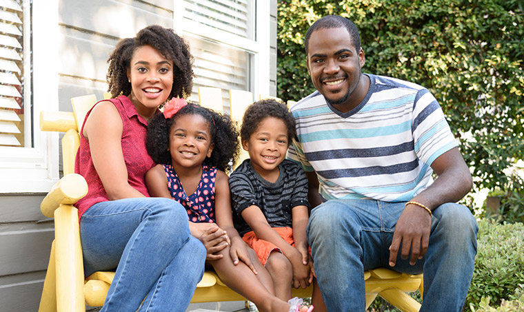 Young Black Parents with their two children are smiling towards the camera on the porch decking. Photo by Johnny Greig/ E+ /Getty Images