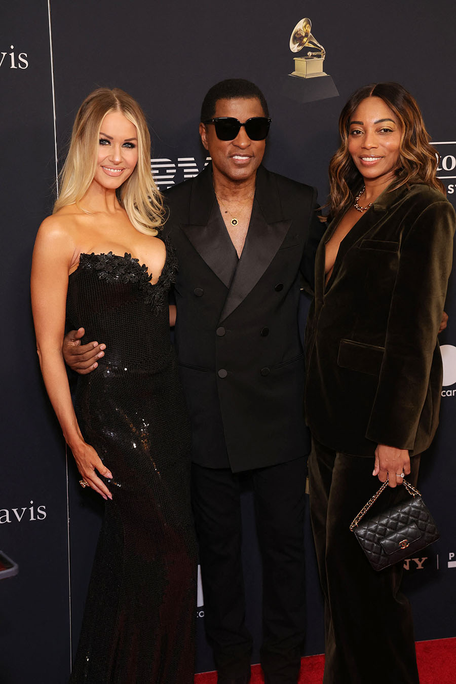 R&B legend Babyface, his girlfriend Rika Tischendorf (L); and producer Dionne Harmon, President of Jesse Collins Entertainment (R) at the GRAMMY Salute to Industry Icons Gala Honoring Avery Lipman and Monte Lipman in Los Angeles, California on January 31, 2026.