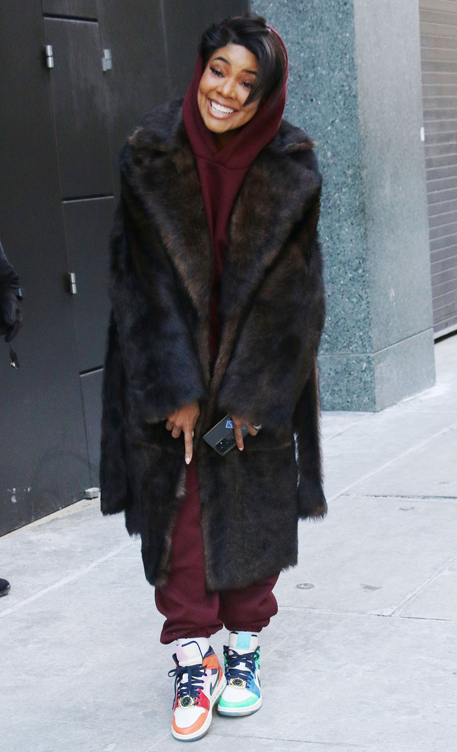 Actress Gabrielle Union braved the freezing weather in New York City. Gabby wore a fur coat, Nike hoodie and matching jogging pants, with a pair of Nike Air Jordan I Mid Fearless Melody Ehsani sneakers after making an appearance on “The View” on Wednesday.