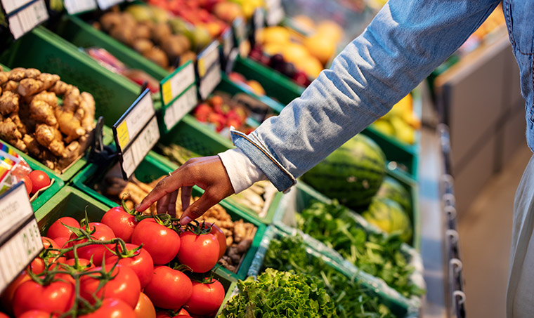 Stock photo – Hand of a woman picking up fresh tomatoes from the crate in grocery store. Woman buying fresh vegetables from produce aisle in supermarket. Photo credit: Luis Alvarez / DigitalVision / Getty Images