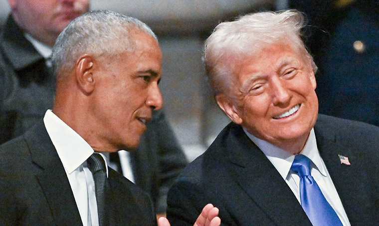 Former President Barack Obama and President-elect Donald Trump speak ahead of the state funeral services for former President Jimmy Carter at the National Cathedral on January 9, 2025 in Washington, D.C. Photo credit: Ricky Carioti – Pool via CNP / MEGA