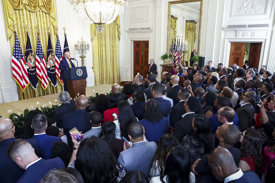 President Donald Trump hosted a Black History Month reception in the East Room of the White House in Washington, DC, on February 18, 2026. The event comes less than two weeks after President Trump’s Truth Social account shared a racist video of former President Barack Obama and former First Lady Michelle Obama. Photo credit: Jim LoScalzo – Pool via CNP / MEGA