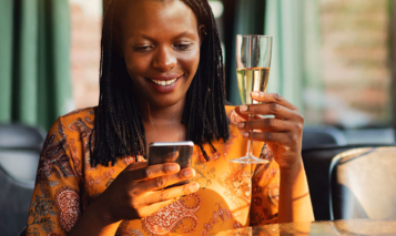 Stock photo – Beautiful young Black woman looking at her mobile phone and smiles while holding glass of wine in her hand. Photo credit: SrdjanPav / E+ / Getty Images