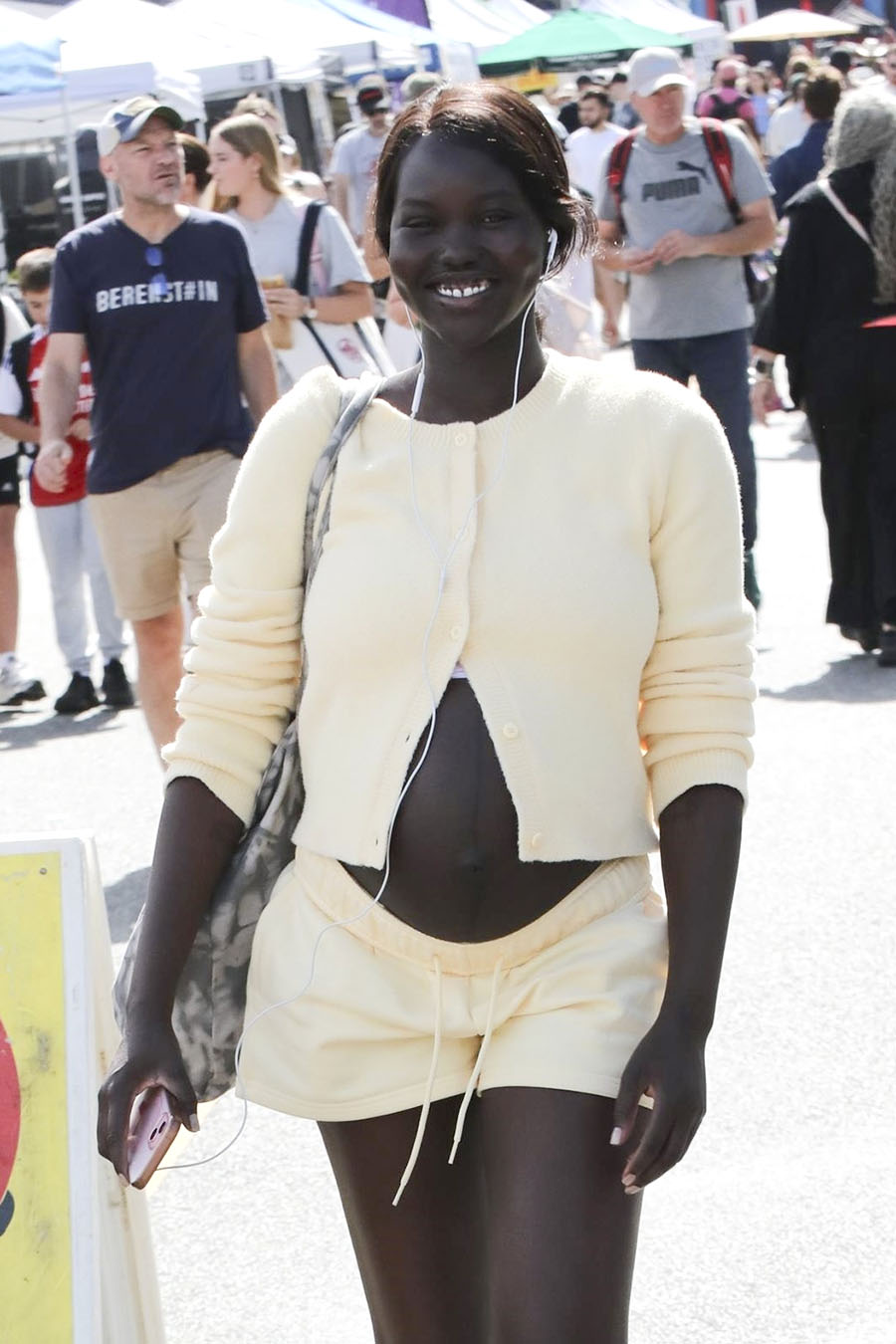 Sudanese-Australian Supermodel Adut Akech, 26, is pregnant with her and Samuel Elkhier’s second child. They welcomed a daughter, Kiki, in 2024. She wore a cute yellow shorts set that revealed her growing baby bump.