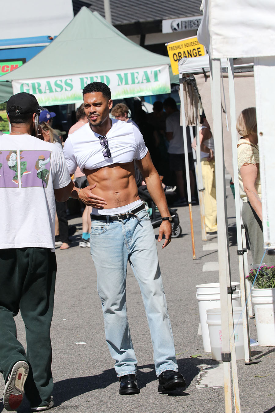 Actor Deric Augustine flaunted his rock hard abs under a cropped T-shirt. He was seen shopping at Studio City Farmers Market recently.
