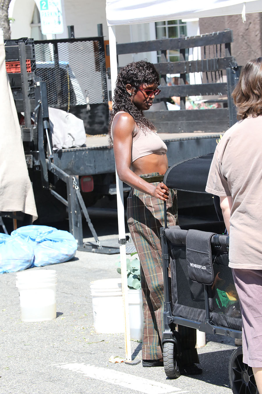 Actress Jodie Turner-Smith was spotted shopping at Studio City Farmers Market recently. She wore a sports bra that showed off her flat abs.