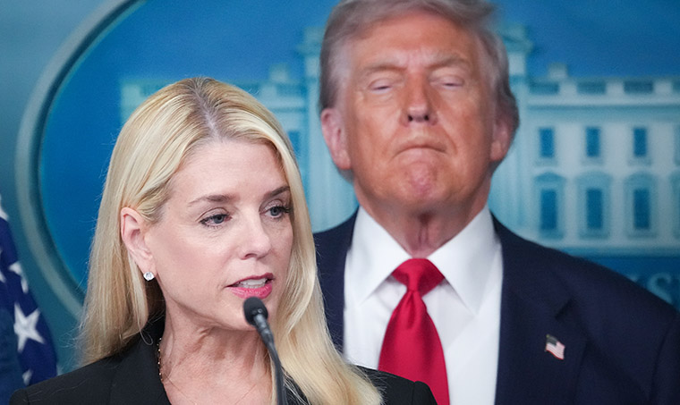 WASHINGTON, DC – AUGUST 11: Attorney General Pam Bondi delivers remarks as U.S. President Donald Trump looks on during a press conference in the James S. Brady Press Briefing Room of the White House August 11, 2025 in Washington, DC. Trump announced he will use his authority to place the DC Metropolitan Police Department under federal control to assist in crime prevention in the nation’s capital, and that the National Guard will be deployed to DC. (Photo by Andrew Harnik/Getty Images)