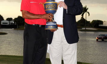 DORAL, FL – MARCH 10: Tiger Woods and Donald Trump pose with the Gene Sarazen Cup after his two-stroke victory during the final round of the World Golf Championships-Cadillac Championship at TPC Blue Monster at Doral on March 10, 2013 in Doral, Florida. (Photo by Stan Badz/PGA TOUR)